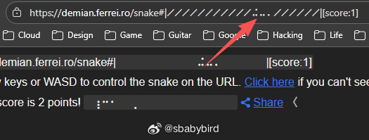 snake 这个网址点进去可以让你在浏览器的 URL 地址栏里玩贪食蛇游戏。