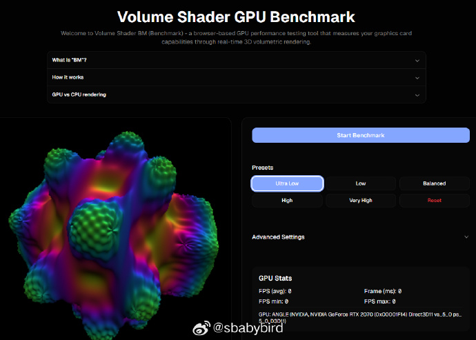 这个网站是一个在线GPU性能测试工具,通过3D体积渲染来检测显卡性能。