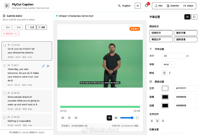 FlyCutCaption 纯前端实现的视频字幕编辑工具,支持字幕裁剪视频,视频字幕合成