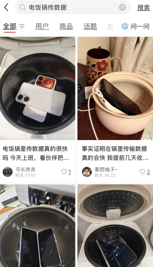 最近流传一个待证实的传说,使用电饭锅可以助力两台手机设备之间数据传输的速度(主要用于新机迁移时)。
