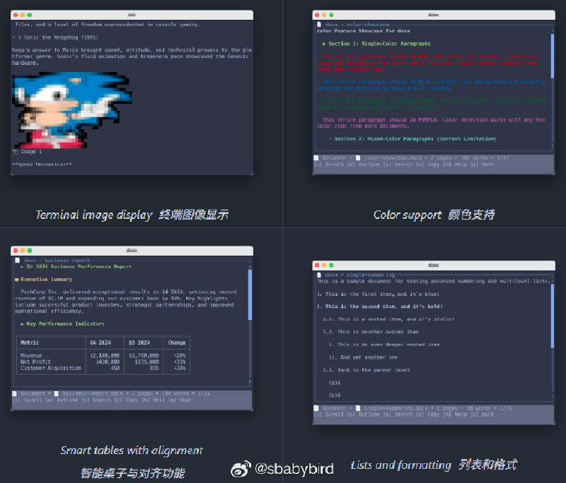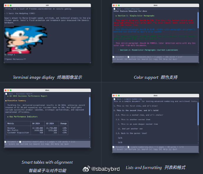 doxx,用于 Word 文件的快速终端原生文档查看器。查看、搜索和导出 .docx 文档,而无需离开命令行。