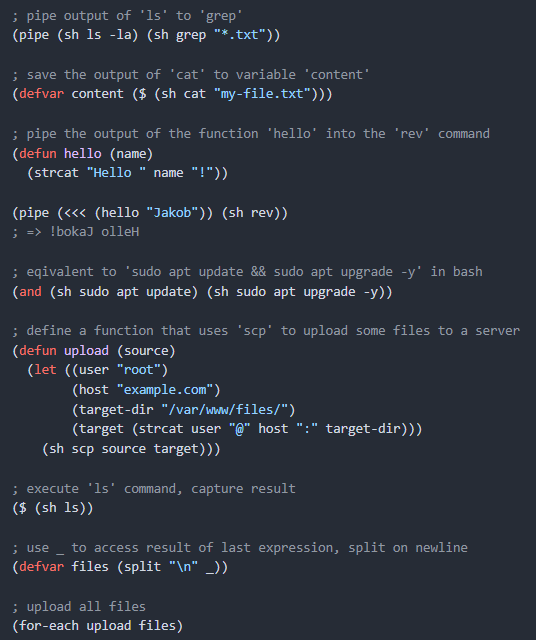 Redstart,是一个用 C++ 编写的轻量级 Lisp 解释器,专注于 Shell 脚本编写。它能够将 Lisp 的强大表达能力与 Unix Shell 的实用性相结合:您可以运行命令、捕获输出、在进程之间进行管道传输,同时仍然使用 Lisp 语法进行逻辑和结构编写。您可以将其视为用 Lisp 而不是 Bash 编写 Shell 脚本。