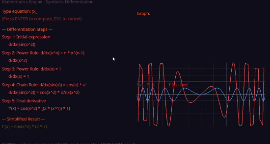 不仅能一步步展示求导过程,还能将多种函数的导数曲线在二维图形中直观对比,甚至支持自定义函数输入。更妙的是,每一步计算都会标明所用的微分法则,帮助理解推导逻辑。