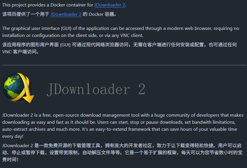 Docker container for JDownloader 2,只需一条命令就能完成部署,通过浏览器直接访问使用 JDownloader 2 完整的下载功能。