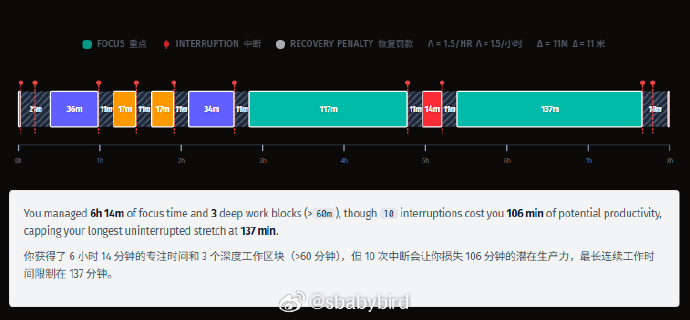 作者对真实数据的引用尤为扎实:整合了González & Mark的3分05秒活动切换研究、Iqbal & Horvitz的10-16分钟恢复时间结论,并亲自构建了可交互的模拟器。