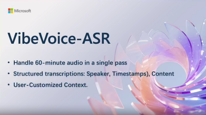 VibeVoice-ASR,一个 9B 参数的统一语音识别模型, 能单次处理长达 60 分钟的音频!