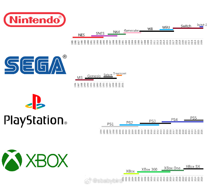 reddit 上有人整理了任天堂、世嘉、索尼等几大主机厂商所推出产品的生命周期图,其中索尼的 PS4 和任天堂的 switch 周期最长,均已超过了十年且还在活跃。